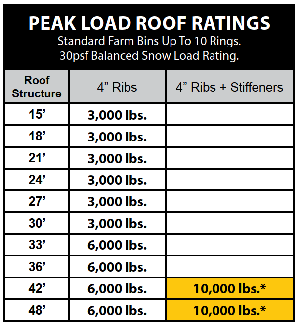 - Roofs are designed to 2012 IBC and rated for 6000# peak loading, 30 psf ground snow loading and 105 mph wind. Optional higher load ratings are available.