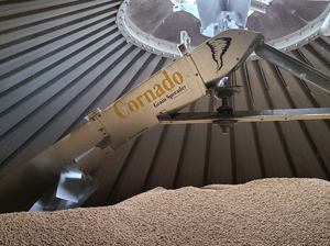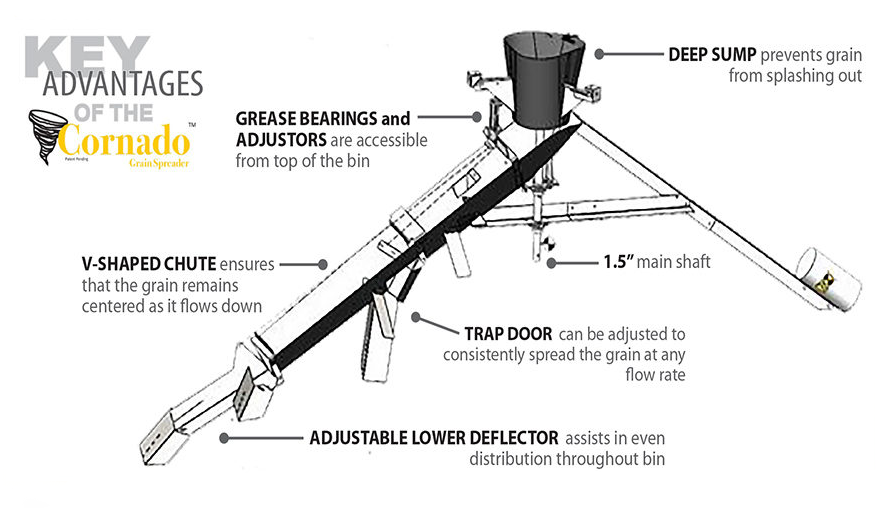A fourth-generation farmer wasn't satisfied with any grain spreader he had owned, so he set out to make his own. The patent-pending Cornado Grain Spreader features an adjustable trap door and lower deflector to ensure there is a consistent spread of grain at any flow rate. The unique design allows for access to the grease bearings and the ability to adjust the spreader from the top of the bin. Created to fit grain bins measuring 24' - 42' in diameter and 48' - 60' in diameter, the Cornado has the ability to handle up to 8,000 bushels/hour.
